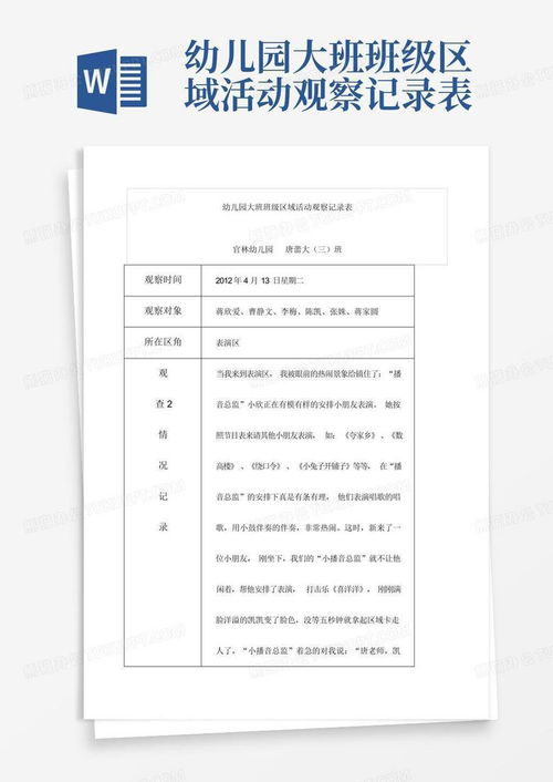 首先,得说说这个神奇的幼儿游戏观察记录表。它就像我的游戏小助手,帮我记录下孩子们在游戏中的点点滴滴。这个表格通常包括时间、地点、游戏内容、参与人数、游戏过程、观察者评价等几个部分。有了它,我就能更加系统地记录和分析孩子们的游戏情况。